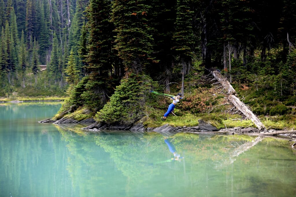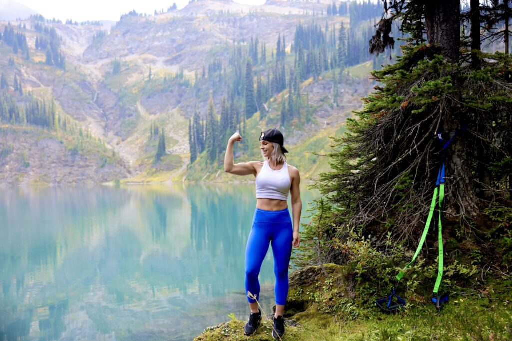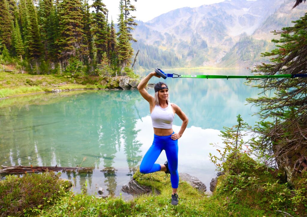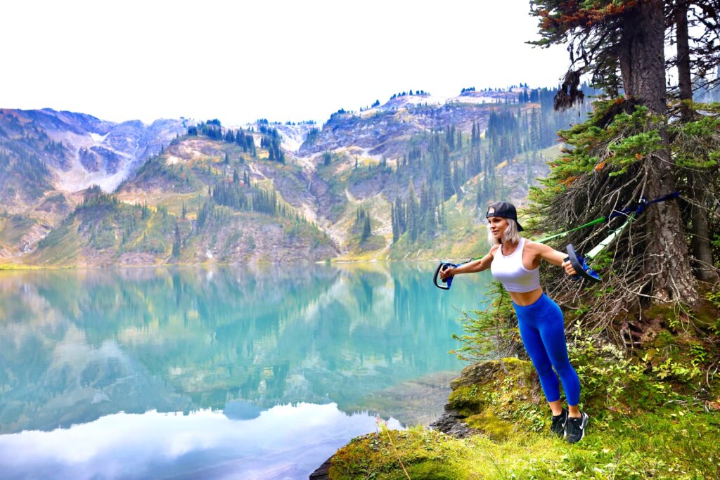 This beautiful location just outside of Revelstoke was about a 2.5K hike and had my heart rate up all the way up. When I arrived I set up my Human Trainer on a tree in the most beautiful place I could find and did my full workout. I can pack my Human Trainer in my backpack wherever I go and come winter I can use it at home with a door in my room. It only takes seconds to set up and you are good to go. Don’t let me forget to tell you about the burn, it was oh so good and I’m feeling it today.